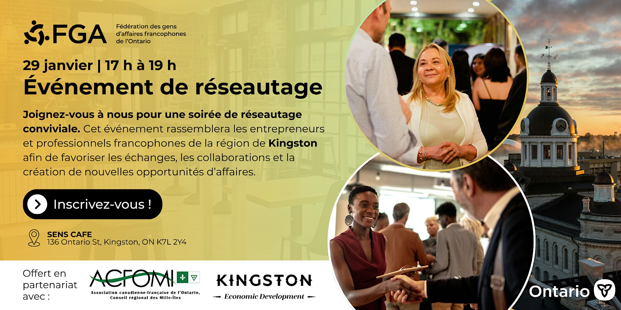 136 Ontario St 136 Ontario Street, Kingston, ON5 à 7 convivial réunissant les gens d’affaires francophones de Kingston pour réseauter et développer de nouvelles opportunités.La Fédération des gens d'affaires francophones de l'Ontario (FGA), en partenariat avec Kingston Economic Development et l’Association canadienne-française de l’Ontario – Conseil régional des Mille-Îles (ACFOMI), a le grand plaisir de vous inviter à un 5 à 7 … Get Tickets